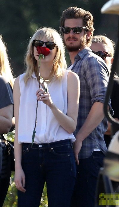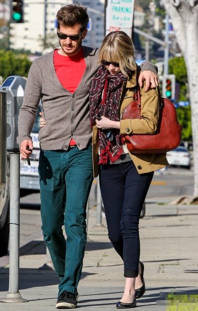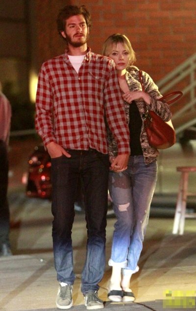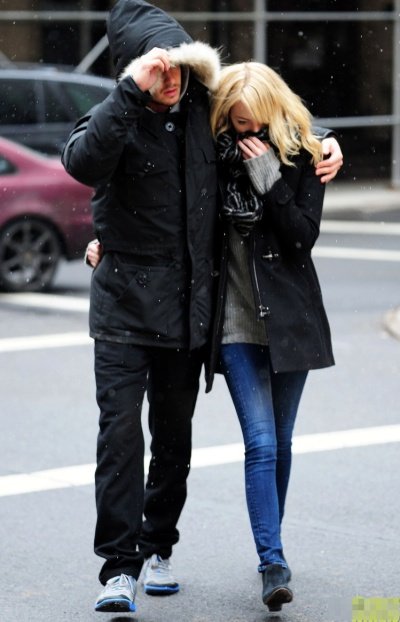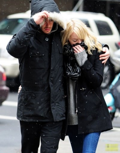 눈 내리던 어느날 뉴욕의 거리를 함께 걷는 앤드류 가필드와 엠마 스톤