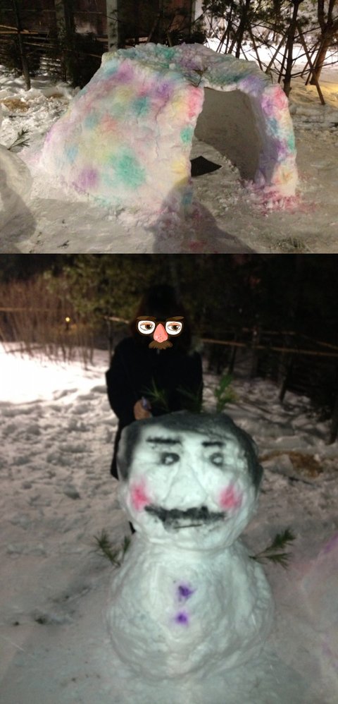 이층까지 완성함. 단단하게 하려 눈 시멘트를 너무 덕지덕지 바르다 보니 이글루 특유의 벽돌모양은 없어짐ㅠㅠ. 그리고 이때 굉장한 오류를 발견함 정말 너무큼ㅋㅋㅋㅋㅋㅋㅋㅋㅋㅋㅋㅋㅋㅋㅋㅋㅋㅋㅋㅋㅋㅋㅋㅋㅋㅋㅋㅋㅋㅋㅋㅋㅋㅋㅋㅋㅋㅋㅋㅋ 우리는 세명인데 오육인용은 된거같음ㅠㅠㅋㅋㅋㅋㅋㅋㅋ