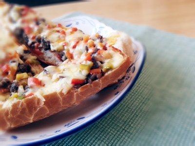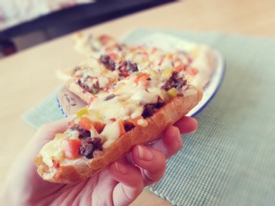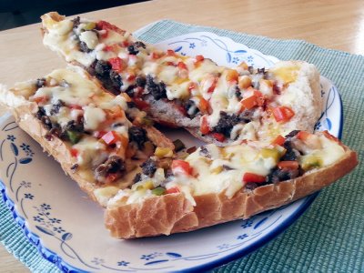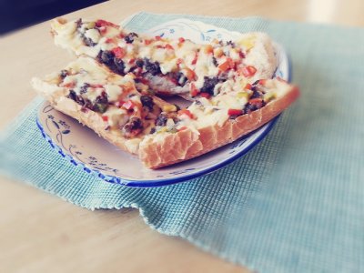 집에 남은 불고기랑 양파, 파프리카를 바삭쫄깃한 바게뜨에 올려 피자를 만들었어요