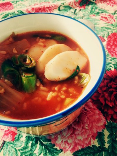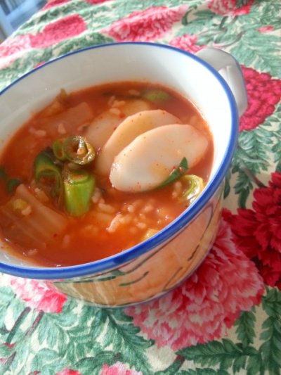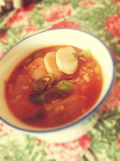 쫄깃한 떡을 넣어 칼칼하게 끓인 김치국밥