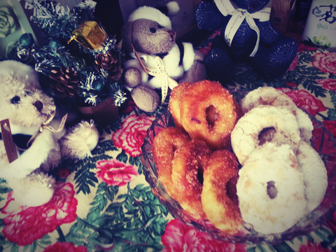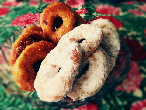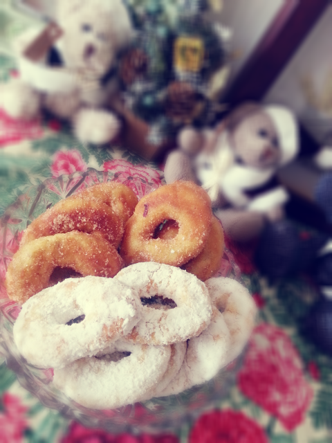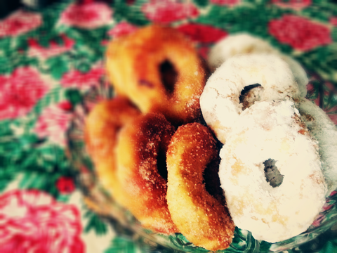 찹쌀가루랑 찐고구마만으로 반죽해서 노릇하게 튀긴 뒤 설탕옷을 입힌 찹쌀도넛^^
