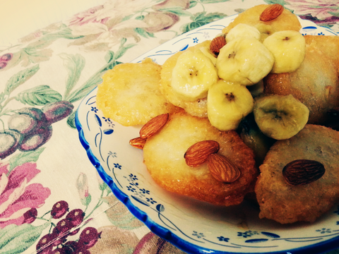 찹쌀반죽을 바삭하게 튀겨서 바나나와 함께 시럽에 버무린 바나나빠스~
