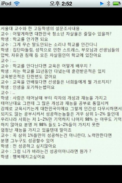 이게 바로 우리나라가 선진국이 되지 못한 이유다 서울대,연세대,고려대 포항공대 등.. 고졸 대졸 심지어대학도 어디냐에따라 그사람을 평가한다는게 참 안타깝다 초딩때부터 압박을 주면서 주입식으로 교육을 시키니 사고가 다 거기서 거기지.. 저 학생이 행복해지고 싶다고 말할때 마음 한쪽이 아려온다..성공이 전부는 아닌데