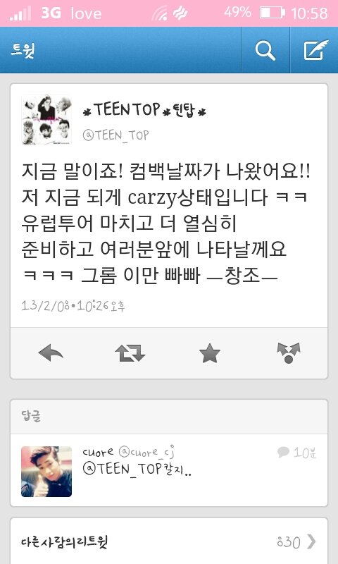 지금모바일이라서 잘안써질수도있겠지만ㅎㅎ한번써봅니다!!틴탑의 막내 창조(95)가 트윗을선사하심>_ㅇ 근데 carzy??????칼지?????ㅎㅎㅎㅎㅎㅎ이번팬싸때는 영어문제집좀 사다바쳐야겠어요ㅎㅎㅎㅎ아방금 미투가떴네요ㅎㅎ보러가야겠어요 피곤할텐데Sns팡팡터트려주는틴탑!!유럽투어!!정규 흥하자!!