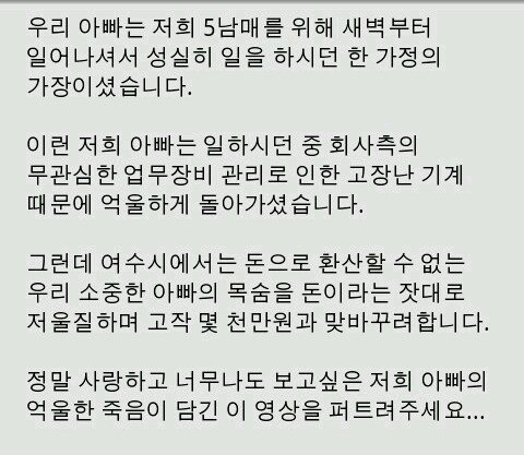 YouTube에서 여수시 환경미화원의 억울한 죽음 보기 - https://www.youtube.com/watch?v=Krgcg2hH6ms&feature=youtube_gdata_player