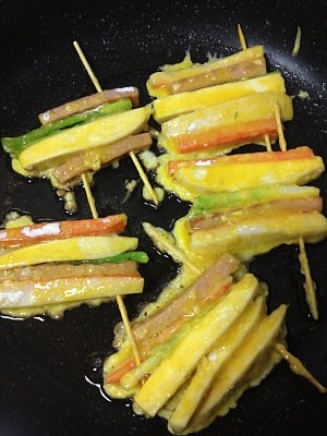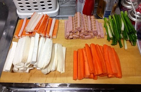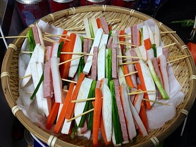 크래미 햄 쪽파 새송이버섯 당근 전부 균등한 크기로 잘라놓고 (꼬치에 끼울 순서대로 놓는게 좋습니다)
