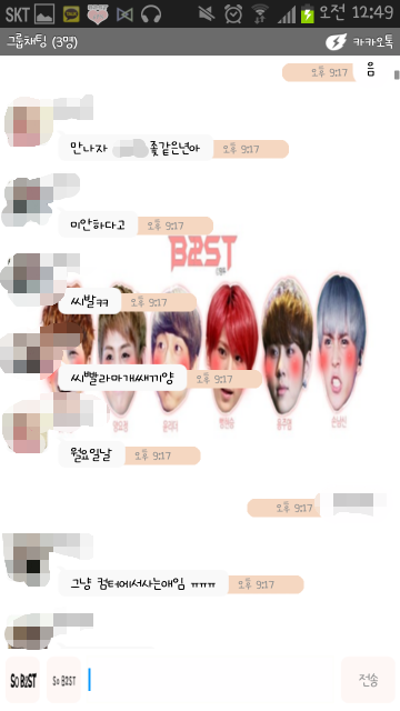 제가 좋아하는 언니랑 친구 두 명은을초대 했습니다 걔네들은 성 드립 하고 저 밟는다고 그러고 뺨 때린다 죽여버린다 뒷통수 친다 이러면서 별의별말 다하던데요 그리고 A한테만 볼 일이 있잖아요 A한테 다 좋으니 부모욕 한거 사과하라니까 "미안하다고,신발아ㅋㅋㅋ됐냐?아니내가엄마년이랬는데ㅋㅋㅋ이게욕한거임?" 이래요 아니 사과 하는데 욕까지 하는 사과가 어디 있어요 그 때 저희 부모님 돌아오셨어요 그리고 계속 오는 제 카톡 소리에 엄마가 폰을 보더니 저에게 왜 이러냐고 묻더군요 저는 다 말했어요