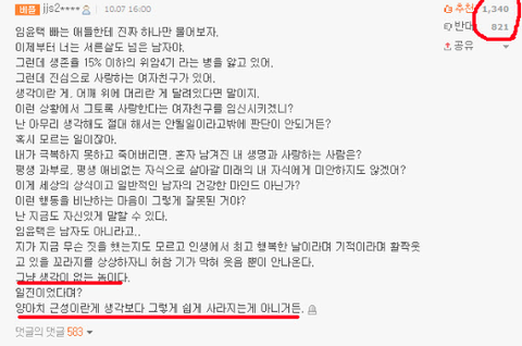 댓글에 더 더러운 모습 보여주시네요 추천수 보십시오 여론이라는 겁니다 일반화 하지말라고 악플은 달던사람이나 다는거지 여기 댓글 다는 사람들 다 선플달던 사람이라고 부끄럽지도 않나? 더럽다 정말 사람들 캭 퉤 어휴 더러워 니들은 일베충이니 뭐니 욕할 자격 없어 왜 일반화해 ? 참나 댓글도 이중적이더니 이중적인 잣대도 보여주네 ---- 네이트판에 위암은 사기라고 욕하던게 베플되고 했는데 이딴식으로 나오니까 역겹다 이중성 더럽다 판 진짜