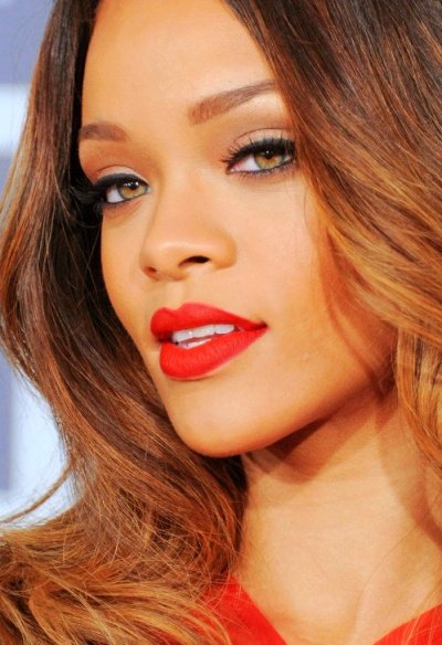 빨간 립스틱으로 포인트 준 메이크업을 하고 온 리한나