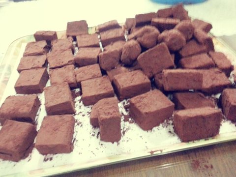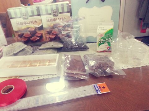 준비물: 초콜렛커버춰다크(800g),밀크(200g) 코코아파우더 (60g) 브라우니믹스,생크림,포장재료,짤주머니,종이호일(유산지,비닐로대체가능),커피빈모양초콜릿(데코할꺼 딴걸로대체가능해여!) 등등 초콜릿은많이 남아서 좀 적게해도 될것같아여 ㅠㅠ 브라우니믹스도 1개면 충분하구여