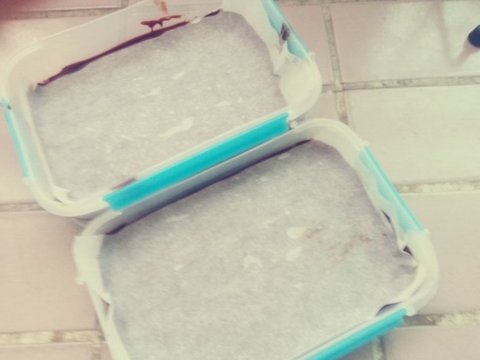 통에 넣고 베란다에서 굳혀주었어요 ㅎㅎ 나중에 떼기쉽게 종이호일을 깔아주었어요! 유산지나 비닐을 대신 깔아도 되요