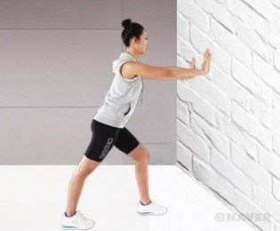 진짜 벽을 미시면 됩니다. 양 손을 벽에 대고, 한 쪽 다리를 뒤로 빼고.