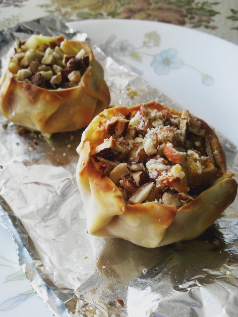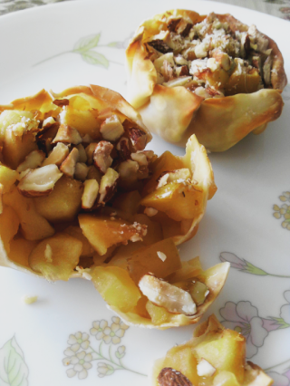 *자른사과와 꿀을 조림 > 만두피에 얹고 그릇모양을 만듬 > 아몬드를 뿌림 > 오븐에 20분 구움 그럼끗