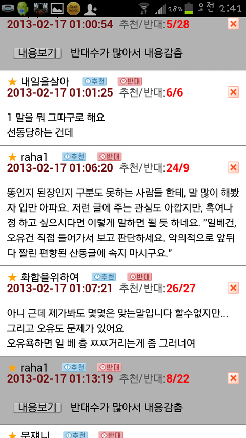 저기 진짜 상종못할 사이트에요 제 친구 남친이 한다길래 잠깐들어갔는데 거기 새누리당비판하는글이있었거든요? 제가 새누리당좋아하는건아닌데 제가 아는사실이랑 다른내용이여서 기사같은거 링크복사해서 잘못된거라고했더니 진짜 한 1분만에 반대 20개넘게받고 욕줄줄이먹고 일베충이냐면서 막 몰아세움 ㅡㅡ 진짜 정신병자들같아요 소름돋아... 어이없어서 왜욕하냐고 따졌더니 차단먹었어요ㅋㅋㅋㅋㅋㅋㅋ차단이유 일베인 내가왜 일베인?내가뭘했다고?ㅋㅋㅋㅋㅋㅋ 그다음부터 다신안감 진짜 망해버렸으면좋겠어ㅠㅠ 사이비집단같아