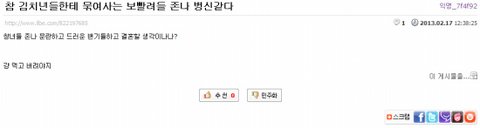 화합을 중시하고요. 저희는 그런 글 혐오합니다. 국민이 합쳐야 할 마당에 지역드립이라뇨. 가당치도 않습니다. 오유랑 항상 언급되고 있는 일베란 사이트를 보여드리죠