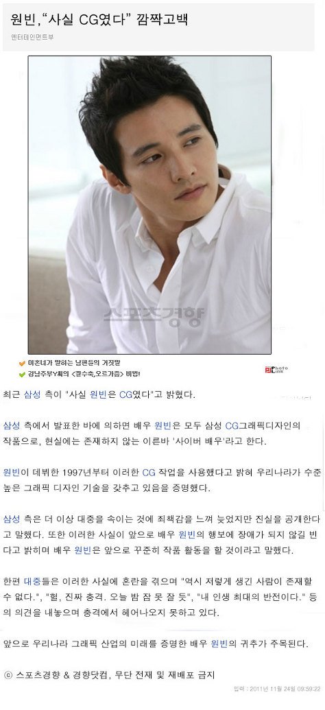 이런 기사도 있었음… 원빈은 삼성에서 CG로 만든 인물이라는 말…
