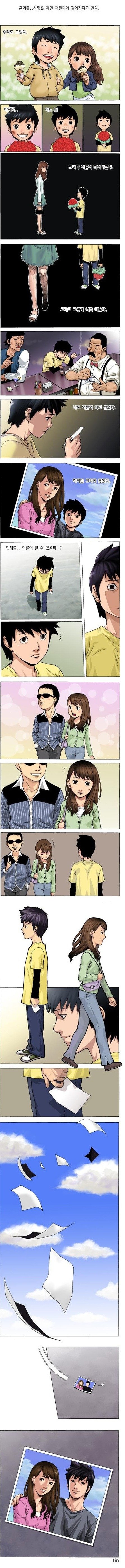 첫번째컷을 보면 사랑을 하면 어린아이같아진 다고 한걸보고 이미 여자는 남자를 사랑하지 않는다는거 그래서 어른이 된거고 남자는 계속 여자를 사랑함,그런데 어느날 지나가다 여자를 봄.근데 여자는 어린아이가 됨,다른 사랑을 만나 어린아이가 된거임.마지막 사진을 보면 남자가 어른이 됨.그럼 남자는 더이상 여자를 사랑하지 않는다는게 되는거임