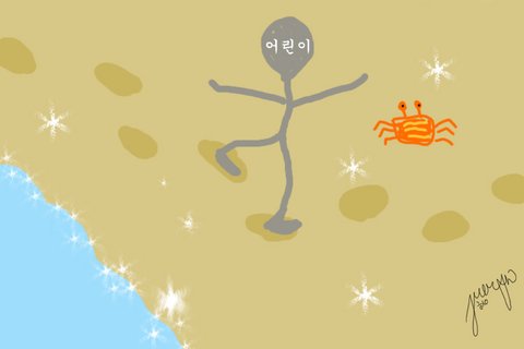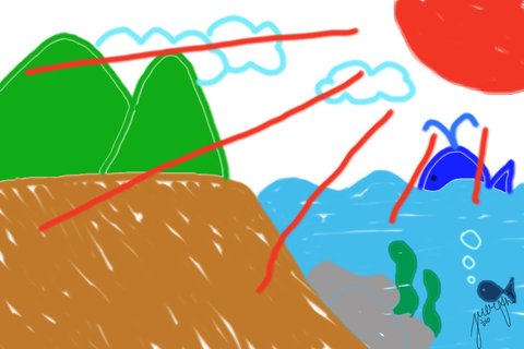 중요포인트는 모서리에 그린 빨간 색 햇님. 이 그림에서 주의할 점은 구름과 산은 꼭 겹쳐서 그려야 한다는 것이다. 그리고 구름의 모양은 항상 올록볼록. 바다에는 언제나 부드러운 파도가 치고 있으며, 해변따위 존재하지 않는다. 바닷속에는 언제나 바위가 서너 개 있고, 그 위에는 미역이 휘날린다. 물고기는 항상 물방울을 두세개 내보내고 있으며, 그 크기는 위로 올라갈수록 커진다. 고래는 밑의 그림처럼 윗부분만 그리는 게 포인트며, 항상 물을 배출하고 있다.