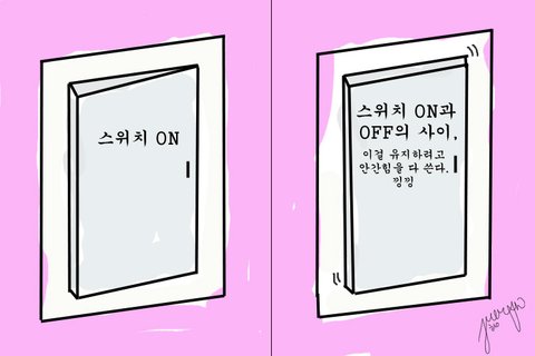 어느 집에나 있는 불 켜는 스위치. 스위치의 양 끝을 양 손으로 살포시 잡고, 불이 켜지지도 꺼지지도 않은 상태를 유지하려고 한다. 하는 도중, 불이 제 방향을 못 잡고 켜졌다 꺼졌다 깜박깜박거려서 엄마의 잔소리를 들을 수 있었다.