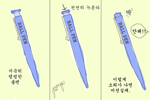 이건 약간의 생각이 필요해서 너무 어릴 적에는 안 했다. 초등학교나 중학교 때쯤, 볼펜을 들고 펜심을 꺼내는 버튼을 천천히 누르면서 '딱' 소리가 언제 나는지 확인도 할 겸, 안 나도록 애를 썼다. 양 손으로 볼펜을 꽉 쥐고 누르면 왠지 안 날 것 만도 같았는데 절대로 그럴 일 없다.