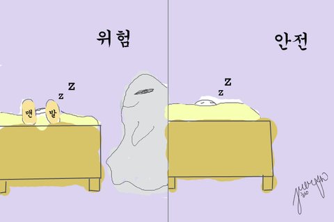 밤에 잘 때, 이불 맨 밑쪽으로 발을 살짝 꺼내면 왠지 모르게 불안했다. 밖에 꺼내놓으면 시원한 바람이 느껴지면서 서늘한 게, 귀신이나 괴물이 잡아먹을 거 같았다. 물론 그럴 일 없지만. 그래서 항상 이불은 발 끝부터 목까지 완벽하게 덮었고, 두 팔도 이불 속으로 집어넣었다. 여름철에는 더운 이불 안을 피해발을 잠깐 꺼내면, 또 불안해서 집어넣고, 더워서 또 꺼내고, 집어넣고를 반복했다.