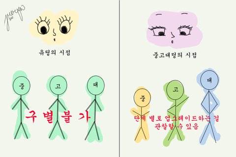어릴 때, 특히 유치원 때는 유치원에 있는 내 친구들을 제외하면 모든 사람들이 그냥 다 어른이였다. 중학생이나 고등학생이나 대학생이나 다 똑같이 보였다. 하지만 중학생이 되고 고등학생이 되면서 점점 차이가 보인다. 그 때쯤 되면 한 살 차이도 다른 점이 보인다.