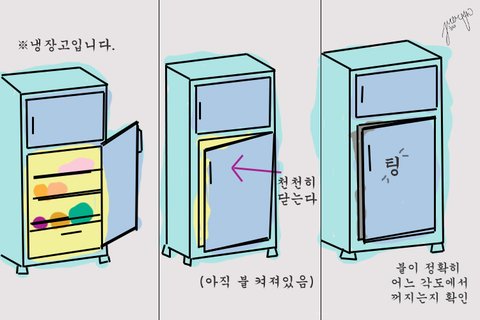 어릴 적에도 냉장고 문을 열면 불이 켜지고 닫으면 꺼진다는 것를 알고 있었다. 그래서 심심할 때나 냉장고에서 뭔가를 꺼낼 일이 생길 때, 문을 열고 천천히 닫으면서 언제 불이 꺼지는지 확인하곤 했다. 정확히 문이 어느 각도에 있을 때 꺼지는 지 확인한 후, 다음 번에 또 와서 똑같은 각도에서 꺼지는지 확인한다.
