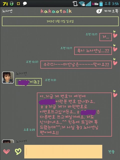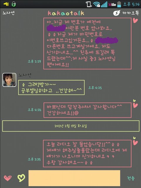 "아 저는 이게 바뀐번호구요~ 저 사실 중3노사연님 왕팬이에요~~이러더라구요.그래서 제가 "만나서 방가~공부열심히하고~~"이렇게 답장을 보냇는데 바쁘신와중에도 답장주셔서 감사하대는거에요 요즘애들이 너무 성숙하고 너무 반듯해서 무섭더라고요..