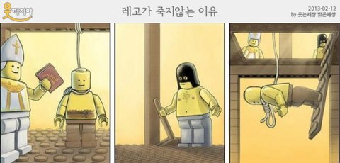 이해 안돼시는분 보세요 저 장면은 사형집행 장면, 바닥이 레고 장난감 바닥임 (손으로 때지 않는한 잘 안떨어져요) 1. 머리에 아무것도 안쓴 레고가 사형집행을 당하나 봅니다 (목에 줄을 매고있음) 2. 사형 집행사의 명령이 떨어져 사행을 시작. 바닥을 없애기 위해 옆에있던 레고가 행동을취함 3. 레고는 장난감바닥에 이미 발이 붙어있어서 떨어지지않음 그래서 레고가 죽지 못하는것