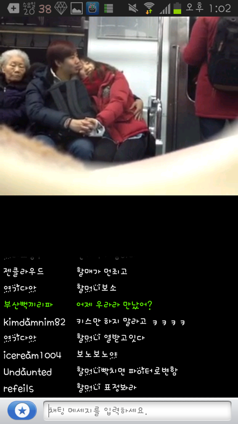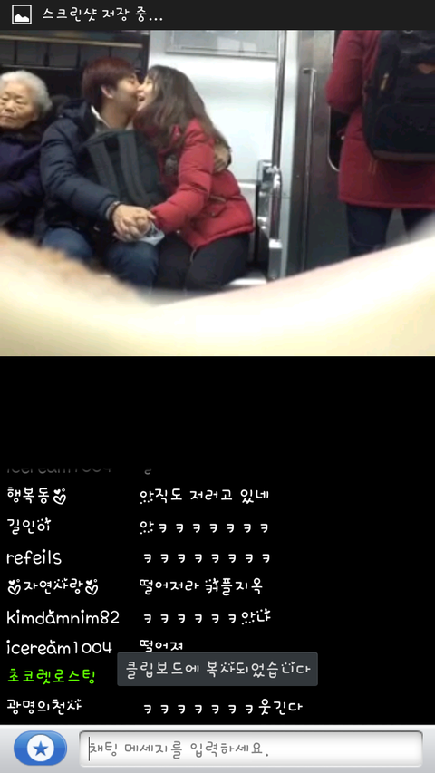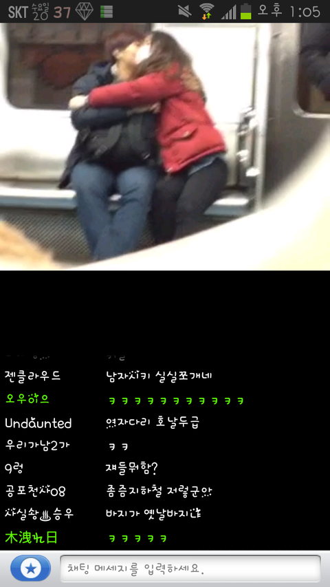 먼저 이사진은 인터넷방송 아프리카TV 라는곳에 한bj가 지하철에타서 앞에앉은 커플이애정행각하는것을 담은영상인대 저는 그장면을 캡처한사진을 올리는겁니다