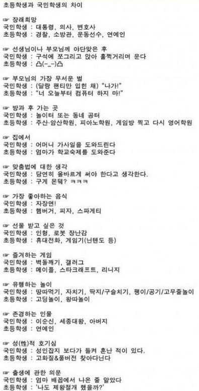 국딩때는 인성교육, 가정교육이 잘되있었고 공부,경쟁에 대한 생각도 없어서 얘들이 순수하고 그때야 말로 아이답게 살았던것 같은데ㅜ 요즘 얘들은 부모의 가정교육도 제대로 못 받고 부모들이 인성이 쓰레기가 되도 공부만 잘하면 된다고 생각하니 얘들이 얘들 답지 못하게되는ㅠ 너무 안타까울 따름
