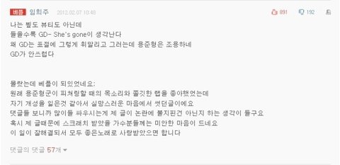 그 당시 지디 보급형 어그로 글로 인해 이 싸움에 지친 빅뱅 팬덤과 비스트 팬덤은 이 일을 넘겼음.