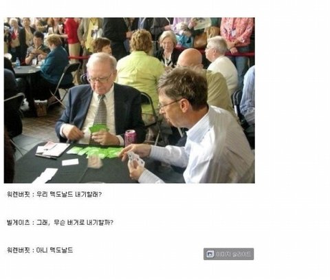 워렌버핏 : 우리 맥도날드 내기할래? 빌게이츠 : 그래, 무슨 버거로 내기할까? 워렌버핏 : 아니 맥도날드