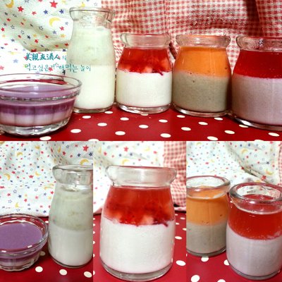 보라색고구마와 딸기, 당근, 바나나, 우유, 요거트로 만든 푸딩들