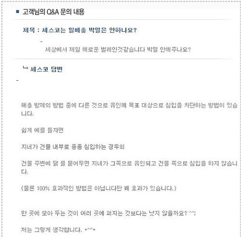 유입지연은 되겠지만 언젠가는 안전하게 번식한 다수의 건강한 개체가 다른 서식지를 찾아 이동하게 됨. 박멸 후에는 모든 위험성이 0%가 되는 것이지만, 저런식으로 완전하게 박멸처리 하지않고 우회 유인하는방법은 대이동이나 습격의 참사를 경험할 확률이 높음. 가장 확실한 방법은 거주자가 원인 개체 접근이 불가능한 곳으로 이사를 가면 됩니다. 일베충은 가상의 인터넷공간에서 허세를 섭취해 무럭무럭 자라는 습성이 있으므로, 검증되지 않은 인터넷 커뮤니티 사용을 중단하고 사회적인 성공을 위해 노력하다보면 주변에 성공한 사람들만 있게되고, 일베충따위는 접근할 수 없습니다.
