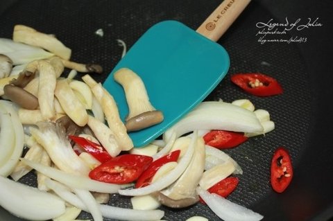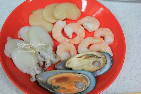 버섯, 양파, 마늘, 갑오징어, 키조개관자, 그린홍합, 자숙새우, 타이거새우, 바지락 품은