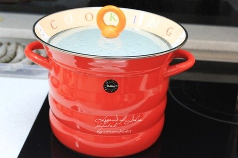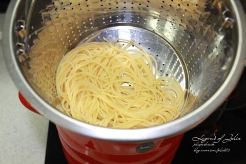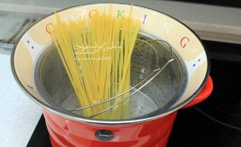 파스타면을 삶을 물을 파스타 냄비에 끓여 올리브오일, 소금, 식초를 넣고 면을 삶는 동안