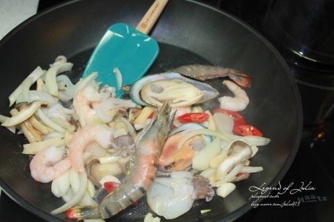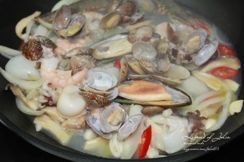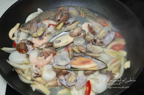 준비된 해물 재료를 모두 투하한후 화이트와인 조금과 레몬즙을 뿌려