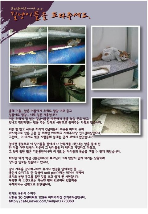 용인시 수지구의 한 학생이 sell pet이라는 네이버 까페에 유기묘 분양 공고를 올린 것을 보고 알게 된 사연입니다. 가능한 빨리 임보처나 입양처를 구해야된다고 합니다. 혹시 가까운 지역이나 같은 지역에 사는 분들이 계시면 도와주세요.