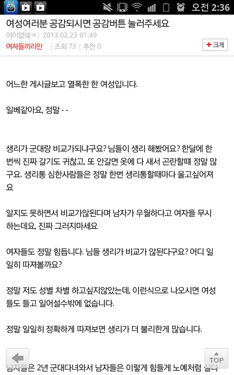 생리는 자연적인거고 군대는 사회적인건데 이거 둘을 비교하면서 '생리하니까 병역의무 없어도 됨'이라고 하는거 자체가 부모토막내 젖갈담가 밥비벼먹을만큼 개념이 없다는걸 인증하는거지 뭐... 세상에 어떻게 자연적인걸 사회적인거랑 비교하는지 ㅋㅋㅋㅋㅋㅋㅋㅋㅋㅋㅋㅋㅋㅋㅋㅋㅋㅋㅋㅋ 생리는 강아지도 하는건데 ㅋㅋㅋㅋㅋㅋㅋㅋ 지 염색체 탓을 하던가 ㅋㅋㅋㅋㅋㅋㅋㅋㅋㅋㅋㅋㅋㅋㅋ 애초에 성에따라 의무를 주고 안주고를 가린 한국의 법부터가 등신이긴 한데, 그걸 모르고 지들 생리가 어쩌구하는애들은 다 부모 없는애들이니까 참아.. 불쌍한것들인데 뭐..... 현실에서도 왕따거나 남자 한번도 못사겨보면서 드라마에만 빠져서 상상속에서만 짝사랑하는 남자랑 몸섞는 쓰래기들이나 생리랑 군대랑 비교하지 주위에있는 멀쩡한여자들은 안그래 내주위에도 없음... 생리랑 군대 비교하는건 지능적안티인 남자가 여자인척하고 마음먹고 하는게 대부분일껄?? 그게 아니라면 그런 저능한 생각을 한다는건 인간의 두뇌로서 하기 힘들어.. 말이되냐 생리랑 군대랑 비교하게? 이글도 분명 남자가 쓴거야. 인간으로 태어나 저렇게 생각하는건 말이 안돼 생리가 불편하던말던 그게 군대랑 무슨상관이냐 ㅋㅋㅋ