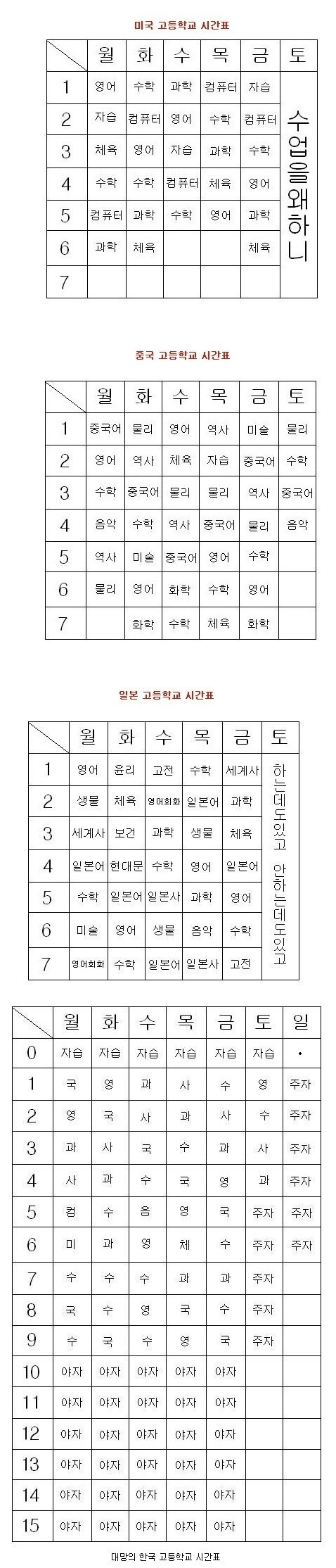 미국고등학교 다니는데 시간표 저렇지 않아요. 시간표는 학생이 직접 짜서 학생마다 다르고요 과학이나 역사 사회는 아예 안듣는 학년도 있어요 그리고 매일 시간표가 다른게 아니라 한학기 내내 시간표 변동없이 매일 같고요. 과목도 훨씬 다양해요. 목재로 집짓기, 부모교육, 건강, 뮤지컬, 합창, 아크릴공예, 등 선택할수 있는 과목이 30여가지가 넘어요