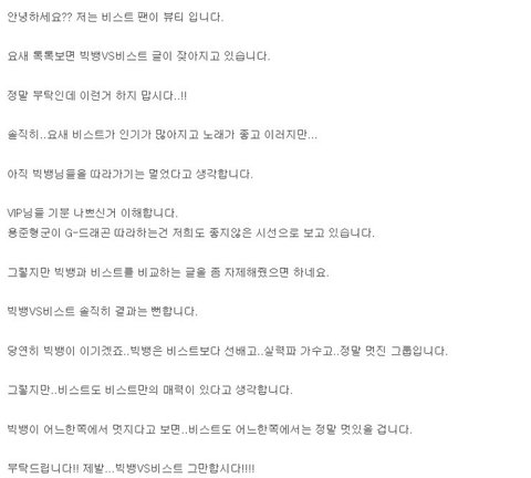 뱅스트(빅뱅과 비스트를 엮어 부른 말)를 외치며 친하게 지낼 것을 요구했다.