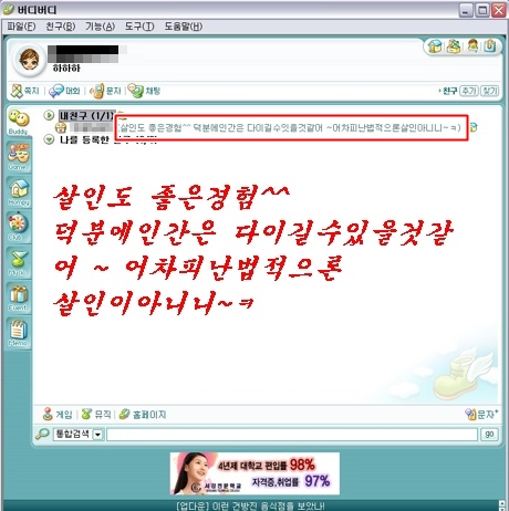 반성의 기미는 조금도 보이지 않으며 초등학교 동창 카페에 “친구들'아' ('들'아'가 필터에 걸려서 임의로 수정 합니다.)나 까페에 자주 못 들어 갈수 도 있어 너무 걱정마” 라는 식을 글을 올리는 이 어처구니없는 행동에 치가 떨리고 손이 부들부들 떨립니다. 그냥 모르는 사람을 죽여도 이렇게는 안하리라고 생각합니다. 아무리 나이가 14살이라고 해도 말입니다.