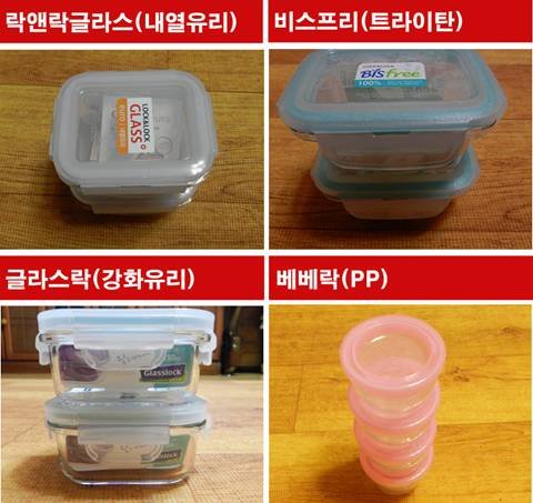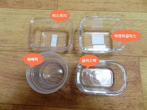 위 사진을 보시면 역시 유리인 락앤락글라스와 글라스락이 투명함을 가지고 있습니다. 그러나 여기서 주목할 제품은 비스프리입니다. 트라이탄이라는 플라스틱 신소재임에도 불구하고 유리처럼 투명함을 지녔다는 것입니다. 실제로 제 주변에서도 ‘가벼운데 유리처럼 투명하다’라는 이유로 비스프리를 사용하시는 분들이 많으시더군요. 투명함에서 가장 취약한 제품은 PP소재인 베베락입니다. 한눈에 봐도 다른 제품에 비해 약간의 불투명함을 띄고 있습니다.