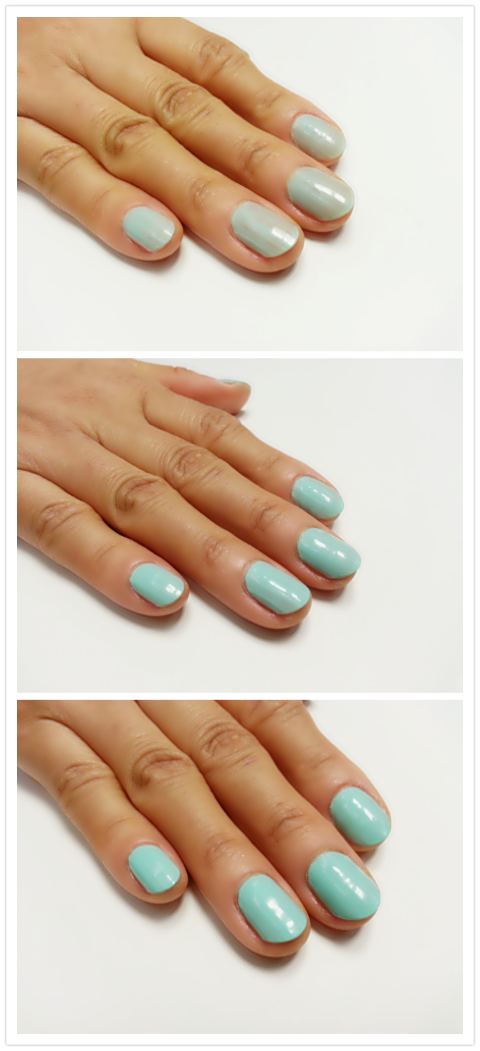 위부터1, 2, 3콧이예요~요런 컬러 바르기 힘든 색상인데 반디 제품은 발림하난 굿! 이네요ㅎ 페인트 질감인데도 내용물이 묽어서 발림이 우수합니다ㅋ 2콧하면 약간 비치고 3콧하면 비침&줄 없이 깔끔하게 바를수 있어요ㅋ가장 큰 장점은 까만 손도 잘 어울리는 민트색 이라는거ㅎㅎ