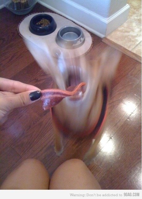 강아지한테 베이컨을 주는데 강아지가 베이컨을 보고 미쳐 날뛰는걸 사진찍은거 ㅇㅇ