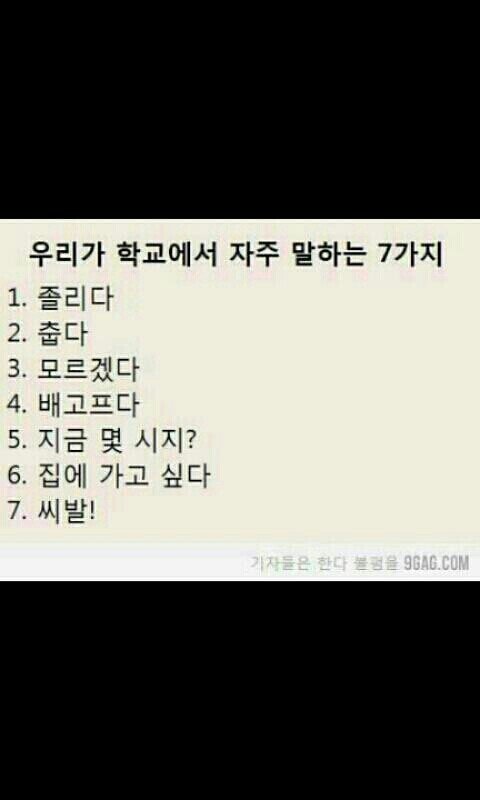 ╋추가 8.매점같이갈사람/매점갔다올사람!!! 9.야이번교시뭐임 10.숙제했냐?/숙제있었어!!!!!!!!!!!!!!!!!????????? 11.(급식에서맛있는거나왔을때)바나나안먹는사람!!!!!!!!!!!!!!!!! 12.아담임진짜싫다ㅡㅡ 13.스타킹있냐? 14.삔이나머리끈있는사람 15.나공책 이면지 한장만... 16.닥쳐 17.체육복좀빌려줘.... 18.담요있는사람ㅠㅠㅠㅠㅠㅠㅠㅠㅠㅠㅠㅠ 19.휴지나물티슈있는사람ㅎㅎㅎㅎㅎㅎㅎ 20.테이프 풀 칼 가위있는사람!!!!!!!!!!!!!!???????????? 21.선생님오늘공부하지말고놀아요~~ 22.화이트나연필있어?ㅎㅎㅎㅎ 23.지우개좀 24.야오늘피시방갈꺼? 25.오늘놀래?/오늘우리집올래? 26.아시X야자진짜하기싫다ㅡㅡ 27.자있어? 28.이거뭐야?/이거어떻게풀어? 29.선생님뭐라고요!?!!1다시말해주세요!!!!!(보통필기할때) 30.야스킨로션있어?오늘안바르고옴ㅡ 31.먹을꺼있어?오늘아침을안먹고와서..ㅎㅎㅎㅎ