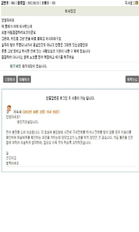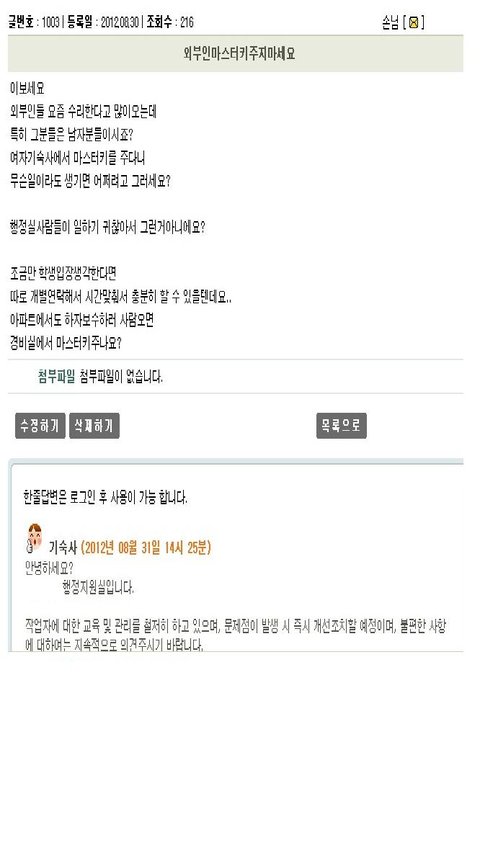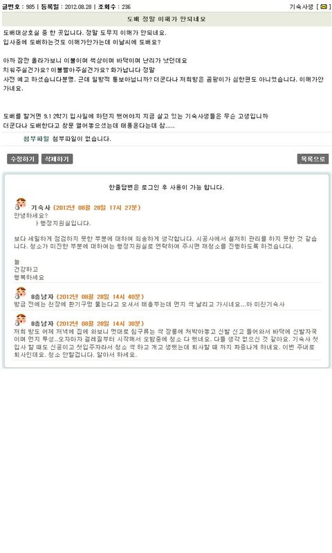 하지만 본인은 분명 잔류 신청서에 호실을 기재했는데도 불구하고 아무런 조치(예를 들면 잔류하는 학생의 호실 목록 체크)를 하지 않는 무능한 행정관리실 사람들에 분노를 느낌.