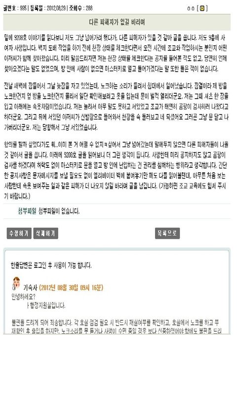 11. 행정관리실의 답변은 언제나 불가피한, 불편을 드려 죄송하다 라는 상투적인 말만 있을 뿐 개선하려는 의지가 전혀없다고 본인은 느낌