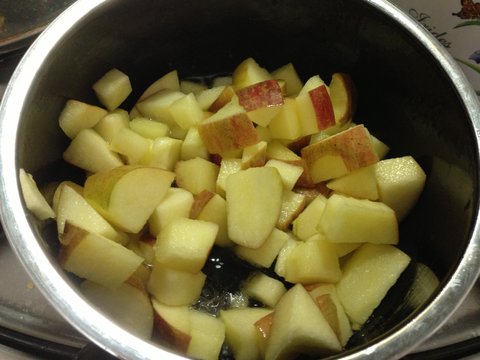 1. 사과를 네모크기로 자른후 꿀을 넣어서 중불에 가열합니당~~ 사과가 말랑 말랑 해지면서 갈색 빛을 띄면 끝이에요~